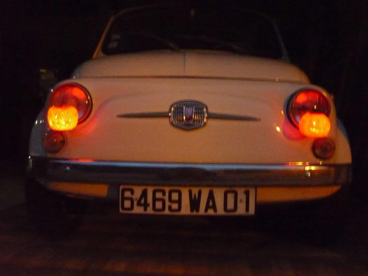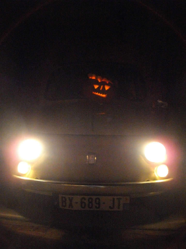 • Bon, les gars, je m'implique vachement là! Le 1er novembre à minuit, j'ai pris ma 500 façon 'Christine' (pour ceux qui on lu Stephen King/vu le film) avec la citrouille sculptée par ma femme pour Haloween.