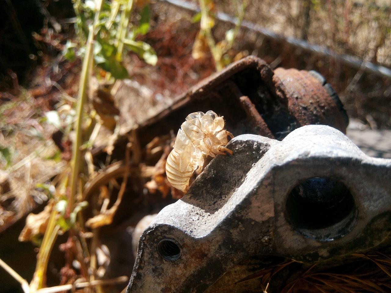 Mue de cigale sur une boite de jardi qui traine au fond de mon jardin...